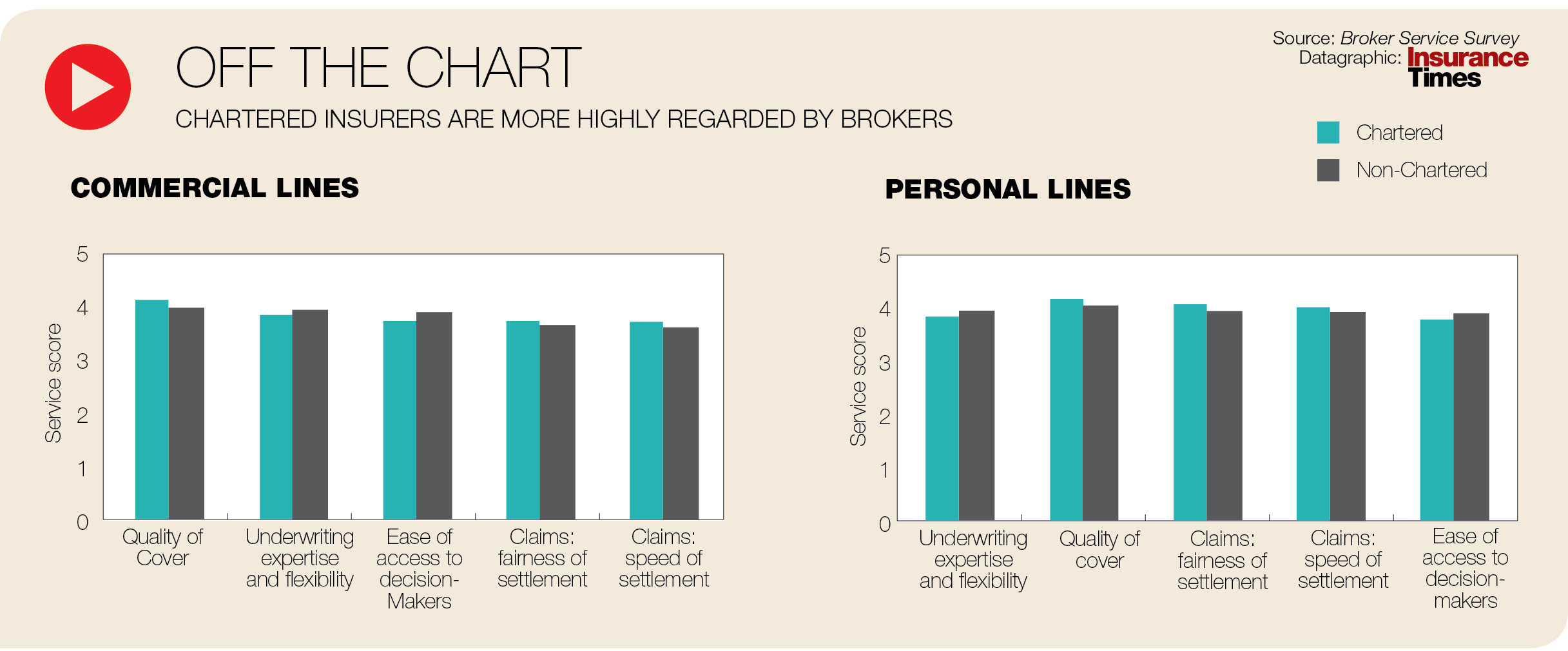 Chartered insurance firms outscored non-Chartered rivals in top-rated service dimensions across both personal and commercial lines. Four out of five insurers who scored highest for broker loyalty were Chartered firms