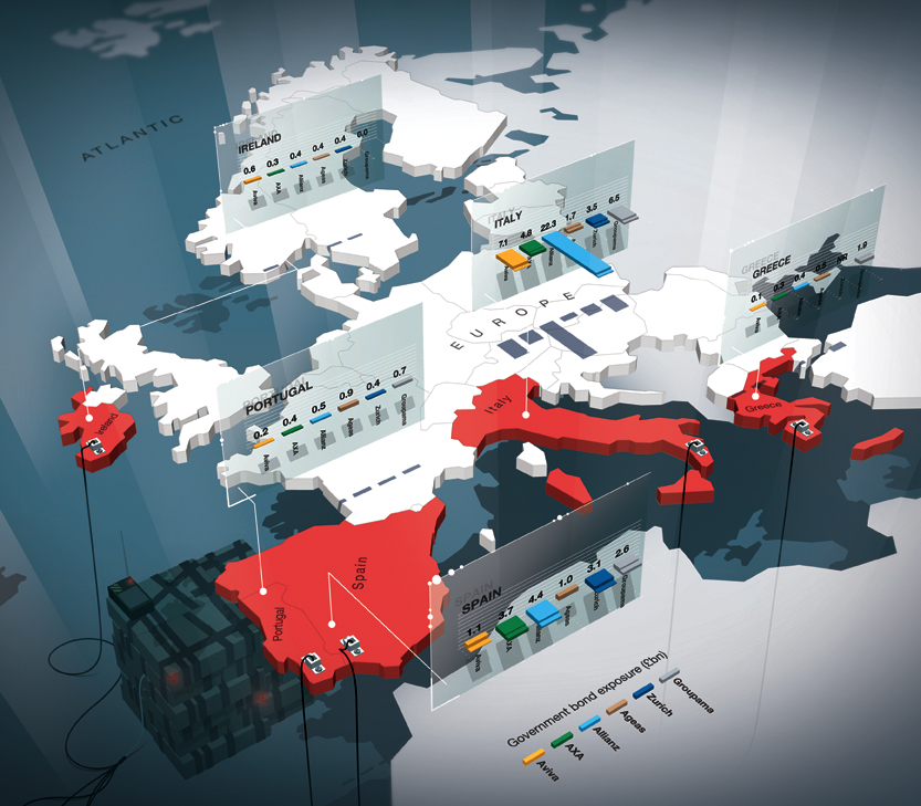 That’s because those insurers have accumulated a large amount of peripheral European government debt to cover their payments to life policyholders and, to a lesser extent, general insurance policyholders, across their European operations.