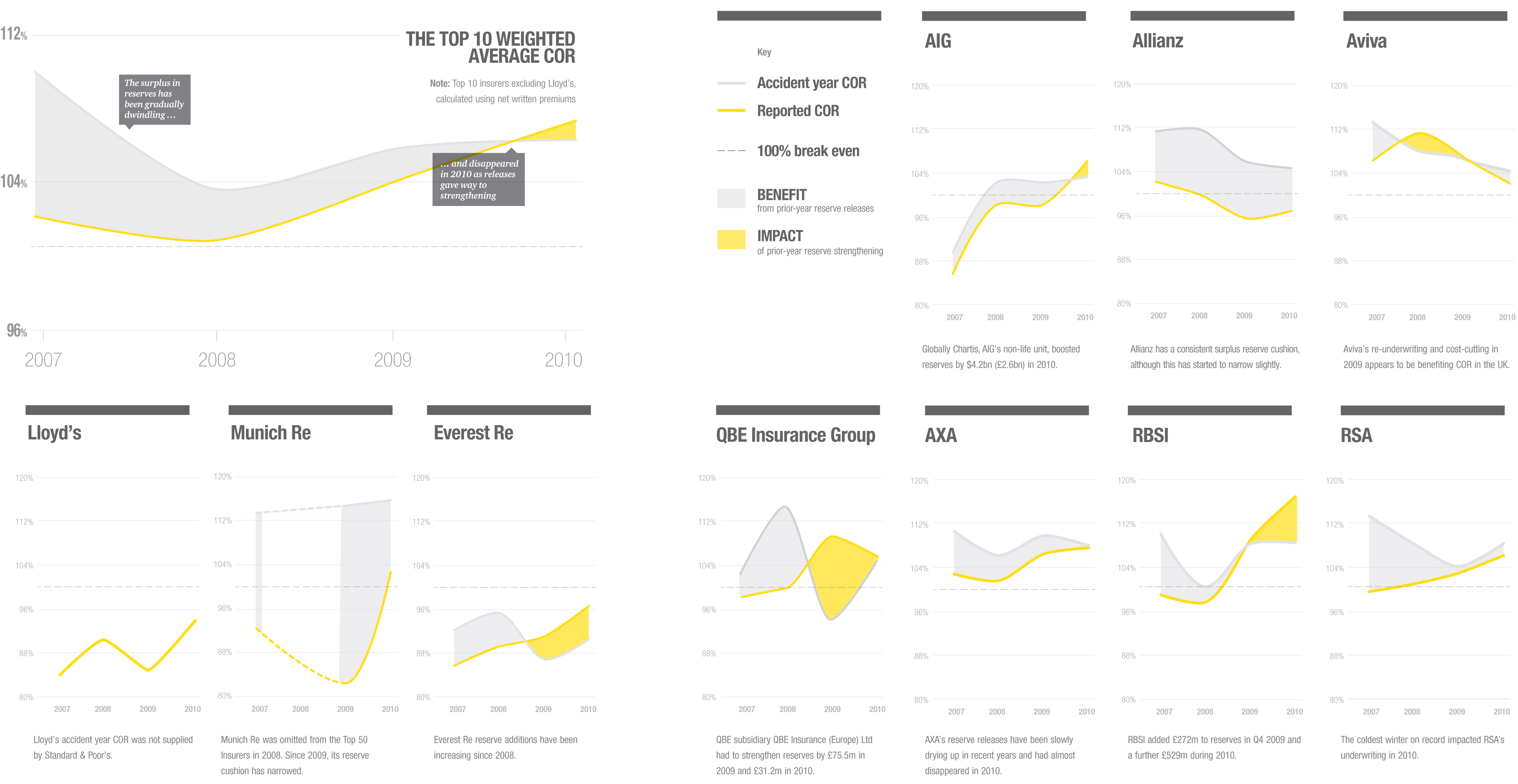 Reserve releases have helped to support insurers’ profitability levels over the past three years, but now they’ve run out. German outfits Allianz and Munich Re look to be among the most prudently positioned, while the situation is improving for Aviva, RSA and, arguably, QBE. But the top 10 weighed average chart shows that overall reserves are running low. AIG, RBSI and Everest Re are all in a phase of paying in.